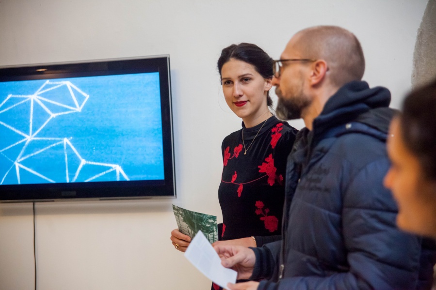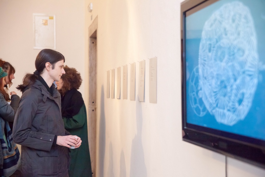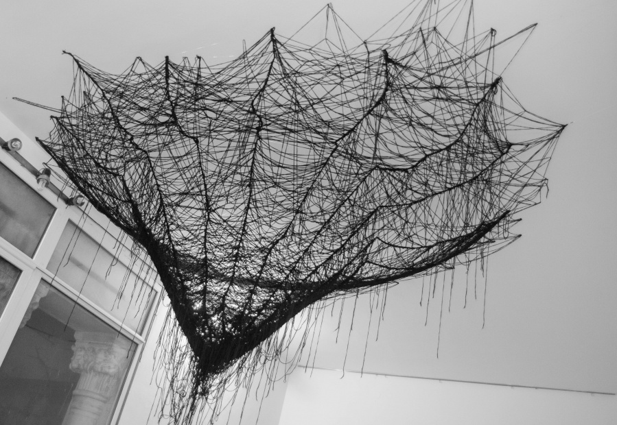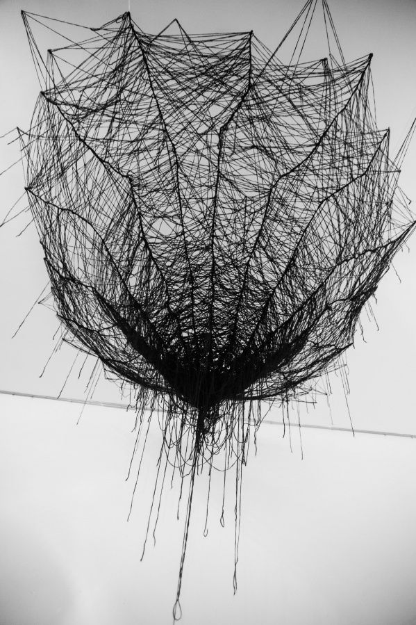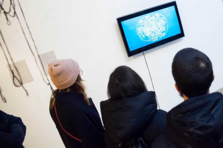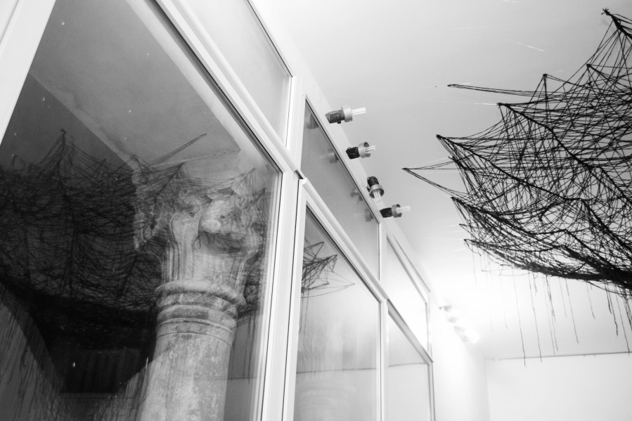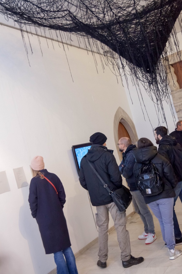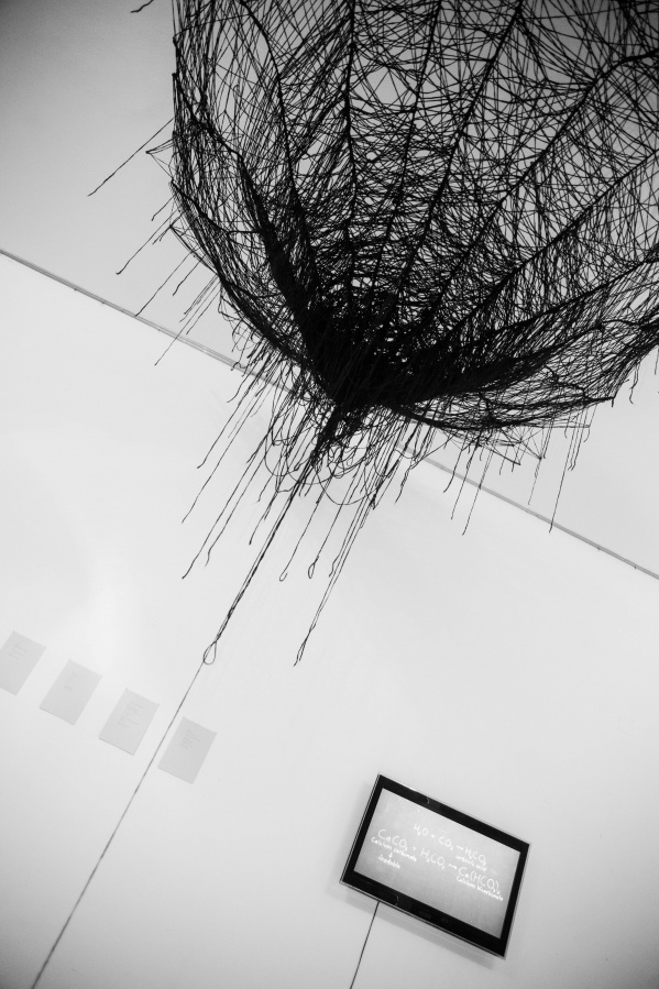 The interconnectedness of people and nature is what this exhibition is to remind us of. In creating this exhibition, Irene Reichart has decided to show just how much in common nature has with what we experience in our lives. Starting with seven poems, we are cast into an emotional vortex of the artist. They unravel an intimate path woven with emotions of disbelief and fear, patience, and finally finding strength. The video we reach next visualises this movement. It shows how our emotions can be correlated with natural processes. These processes show us how dissolution can be constructive, and that even a void can be a creation. Similarly, for us to grow we first have to crumble to pieces and let go of what we thought was truth and the striking woollen installation represents threads of processes composing and decomposing us as individuals.