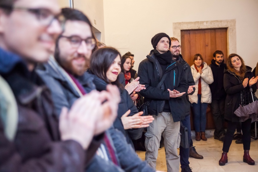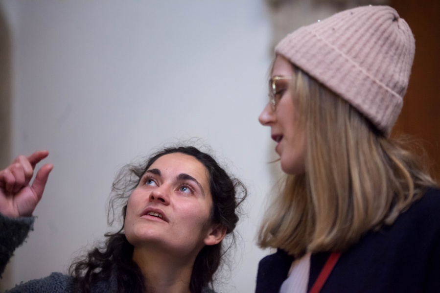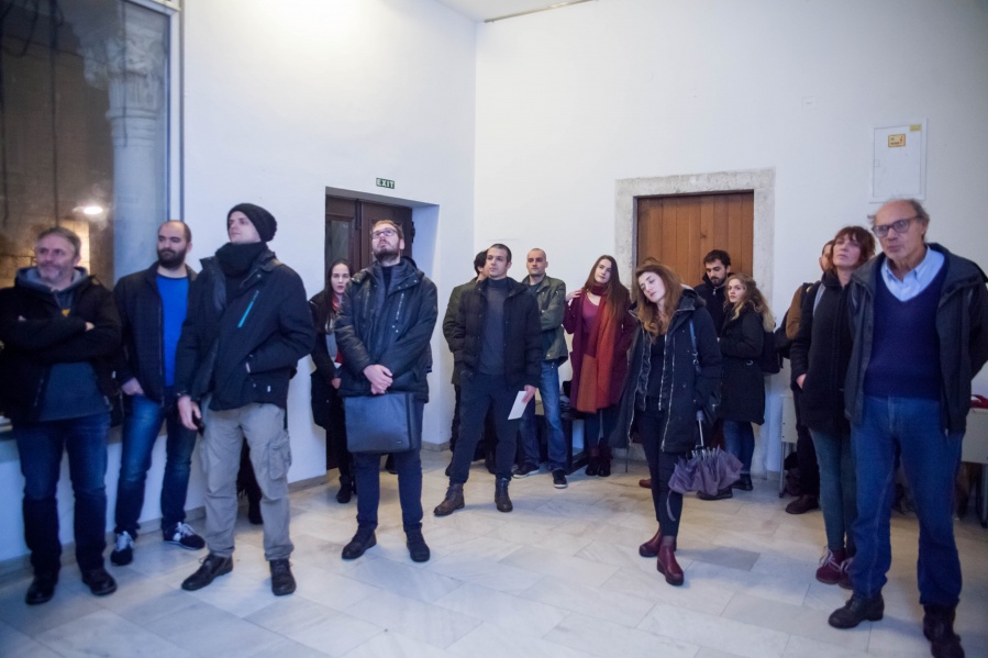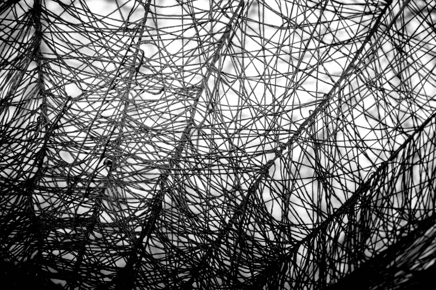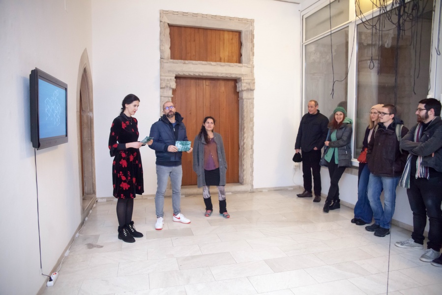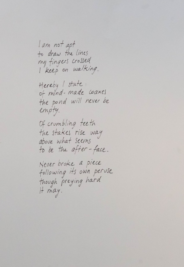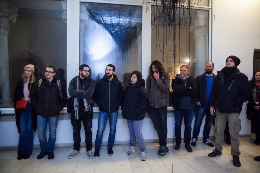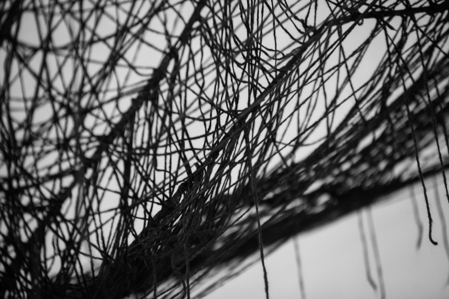 The interconnectedness of people and nature is what this exhibition is to remind us of. In creating this exhibition, Irene Reichart has decided to show just how much in common nature has with what we experience in our lives. Starting with seven poems, we are cast into an emotional vortex of the artist. They unravel an intimate path woven with emotions of disbelief and fear, patience, and finally finding strength. The video we reach next visualises this movement. It shows how our emotions can be correlated with natural processes. These processes show us how dissolution can be constructive, and that even a void can be a creation. Similarly, for us to grow we first have to crumble to pieces and let go of what we thought was truth and the striking woollen installation represents threads of processes composing and decomposing us as individuals.